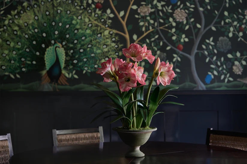 Let this lush and very lifelike faux amaryllis plant elevate your front hall console or living room coffee table for the holidays and beyond. The fresh pink and white blooms add a touch of charm to any setting.