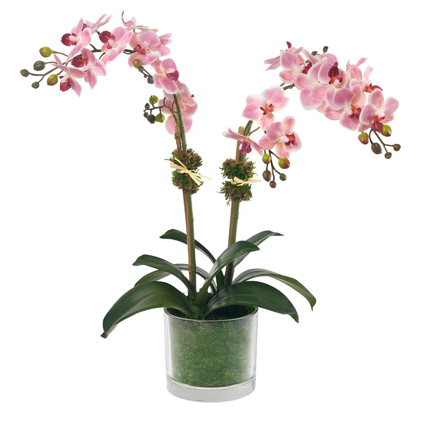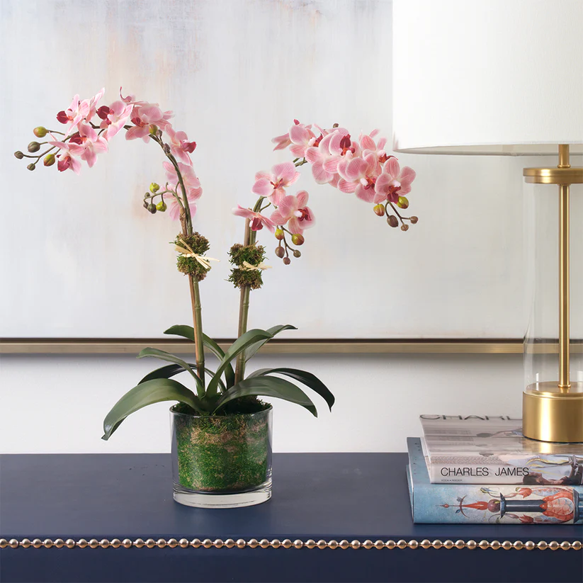 There's a whole lot to love about faux orchids... They need very little care and never wilt! We've planted pretty pink phalaenopsis orchids in a glass vase lined with preserved moss to create a design that makes the perfect addition to your desk or dresser.